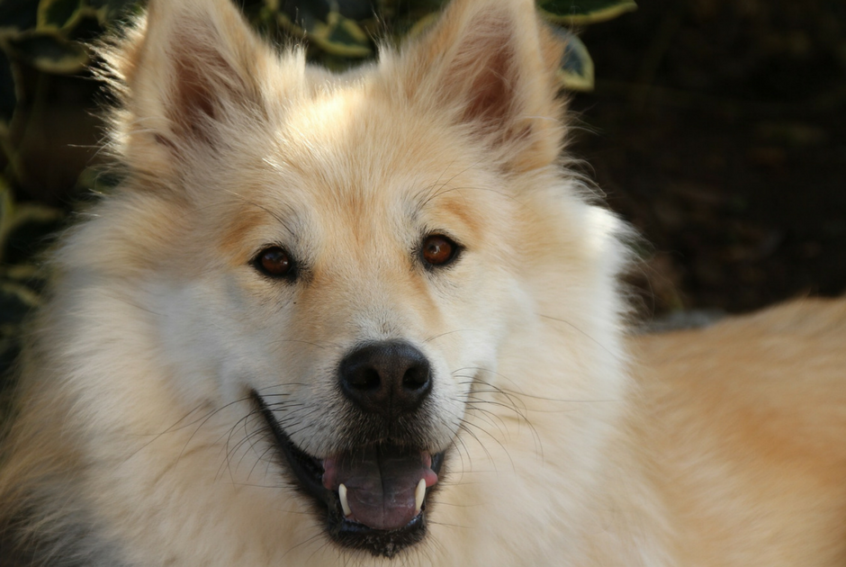 der hund lächelt. ein weiches entspanntes maul, lockere mimik und entspannt aufgestellt augen zeugen davon, dass er gut drauf ist und erwartungsvoll (aber ohne aufregung) seinen menschen anschaut.