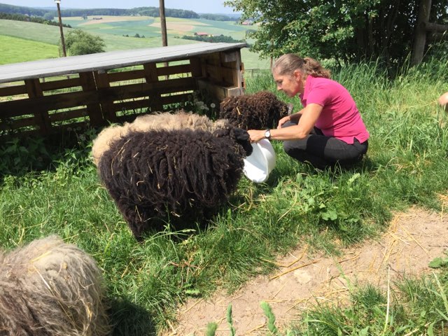 die ouessant-schäfchen mokka, melange, cappucchino, brownie und blackie sind die niedlichsten rasenmäher, die man sich vorstellen kann! wenn sie grad nicht damit beschäftigt sind, meine hanglagen vom hohen gras zu befreien, liegen sie wiederkäuend in der wiese und verströmen sanftmut oder haben ihre verrückten 5 minuten und rennen mit bocksprüngen wild und voller übermut herum. in jedem fall ein vergnügen, zeit bei ihnen zu verbringen!