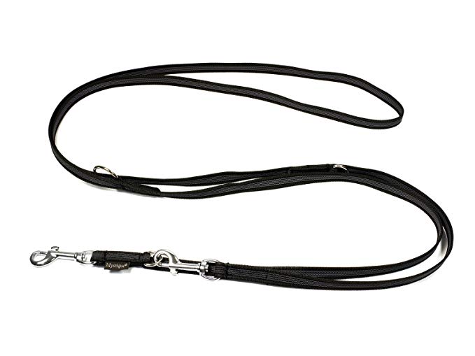 die sogenannte umhängeleine hat 2 karabiner und zusätzliche ringe, damit die leine entweder kürzer oder länger gestellt werden kann. die länge variiert je nach modell zwischen 1,5m bis 2m (die häufigsten) oder 2m – 3m. in der längeren ausführung mit 3 meter ist es eine absolut brauchbare und praktische leine für den alltag. in der vollen länge ausreichend lang für den hund, damit der sich halbwegs bewegen kann, für die stadt oder ein stück neben der straße entlang zum einfach kürzer schnallen.