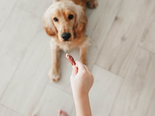 der mensch hält dem hund ein leckerchen vor die nase und lockt ihn damit.